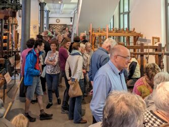 Im Museum selbst riss der Besucheransturm nie ab. Immer wieder erklärten die Mitglieder des Industrie- und Bandmuseum e.V. die Funktionsweise der historischen Webtechnik. Als dann 14.00 Uhr die Posamentiermeisterin im Ruhestand, Susanne Heilmann-Schink, Vorführungen am Posamentenwebstuhl anbot, bildete sich eine riesige Menschentraube ringsherum.